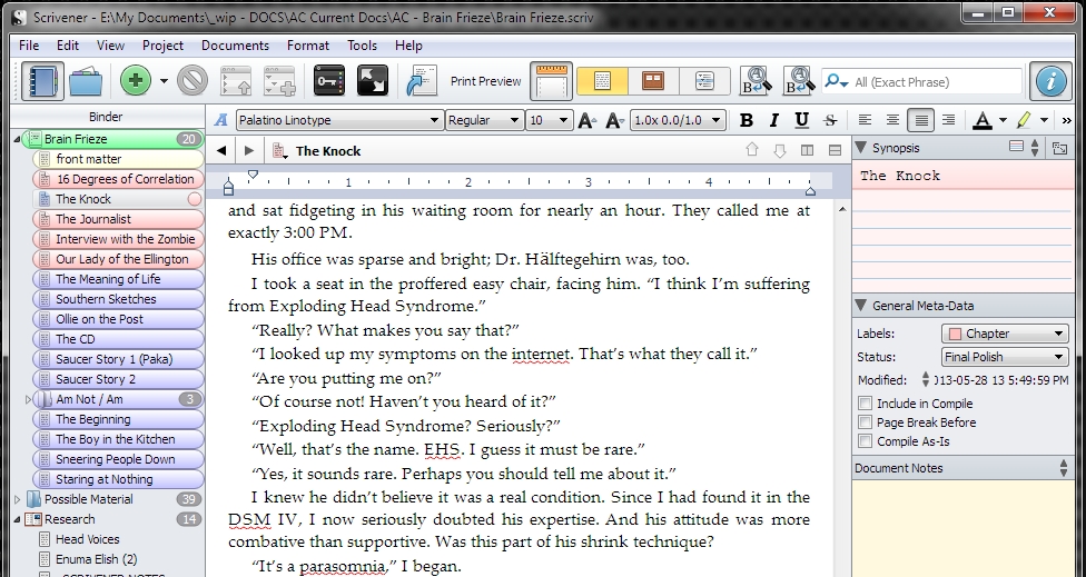 To preserve the conventional meaning of “document,” from here on I’ll refer to a Scrivener “document” as a “doc.”